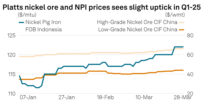 Platts assessed daily spot NPI with 10% nickel content at $117.5/mtu FOB Indonesia April 11, up 2.5% since the start of Q1.